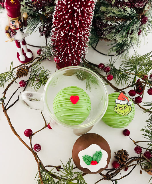 Hot Chocolate Bombs- Grinch, Ornament, Snowflake, Santa Claus Belt