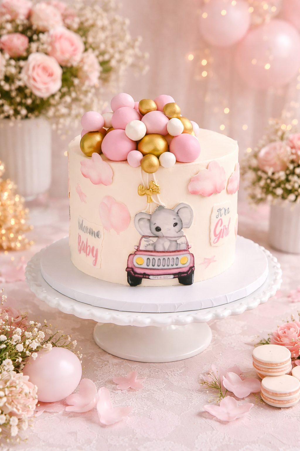 Celebrate a baby shower with the Elephant Adventure: It’s a Girl! 🎀🐘 baby shower cake, available in three sizes to perfectly fit your event. Expertly crafted for a memorable centerpiece, this cake is offered exclusively for Fresno delivery or local pickup, ensuring freshness and convenience without shipping. Ideal for adding a charming and thoughtful touch to your celebration.
